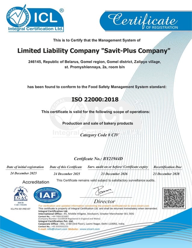 Сертификат ISO 9001:2015 (Сертификат соответствия системе менеджменту качества применительно к производству, хранению и реализации хлебобулочных изделий) подтверждает, что внутри организации функционирует исключительная система управления качеством. Эта система обеспечивает стабильное высокое качество продуктов, независимо от меняющихся внешних или внутренних условий. Сертификат ISO 9001:2015 является надежным залогом качества.